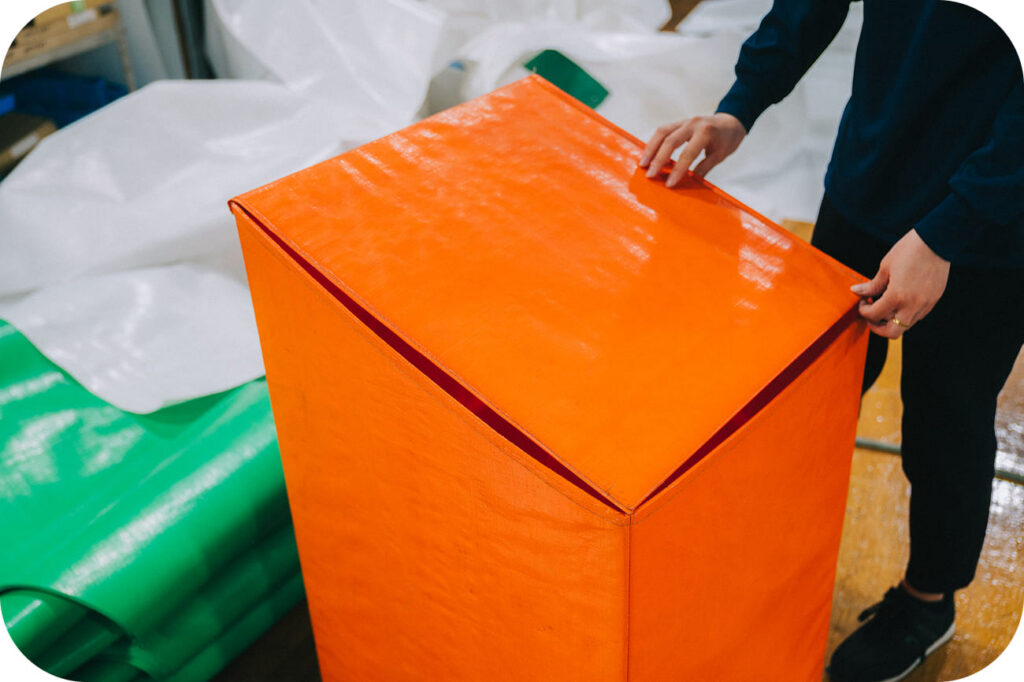 屋外で廃材などを収納する際、雨水がたまらないように考案された商品です。